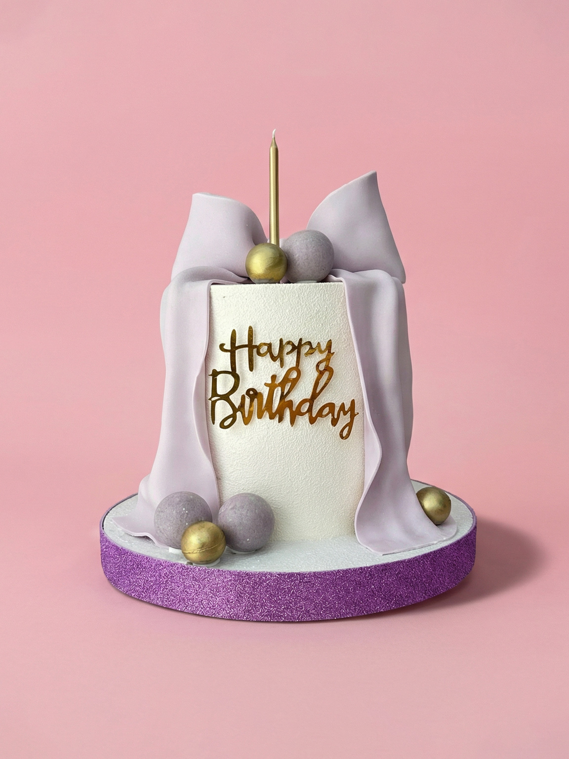 This cake is a masterclass in contrasting textures and graceful lines. The tall tier is finished with a pristine white chocolate velour, giving it a sophisticated matte, grainy appearance. It is crowned with a voluminous lavender bow made of flexible fondant that drapes elegantly down the sides like fine fabric. The composition is completed with a scattering of pearl-finished spheres in muted purple and metallic gold, all resting on a vibrant purple glitter base.