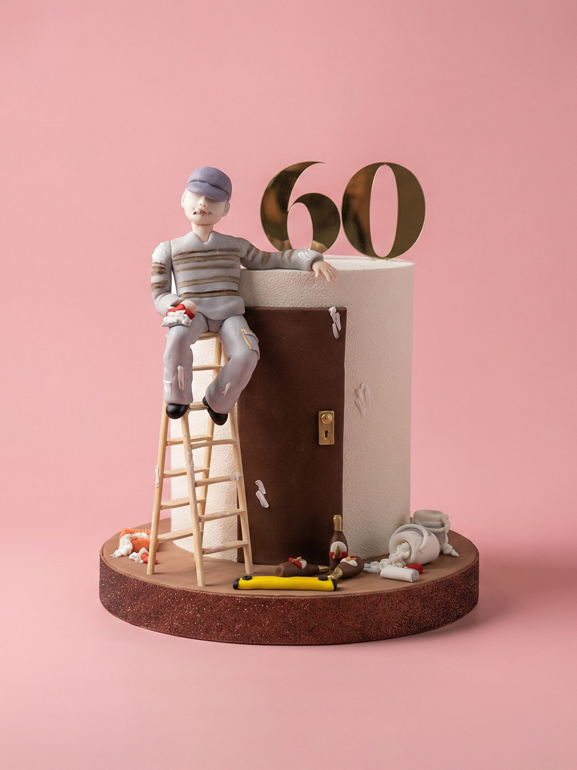 This unique cake is a masterpiece of storytelling and character design, celebrating a life of hard work with a touch of humor. The single tier is finished in a crisp white velvet coating, designed to look like a freshly plastered wall. It features a detailed scene with a handcrafted figurine of a worker in a cap, taking a well-deserved break atop a wooden ladder. Every detail adds to the narrative: a brown door, spilled paint buckets, tools, and even tiny bottles scattered around the base. A gleaming gold “60” topper crowns the scene, marking a significant milestone.