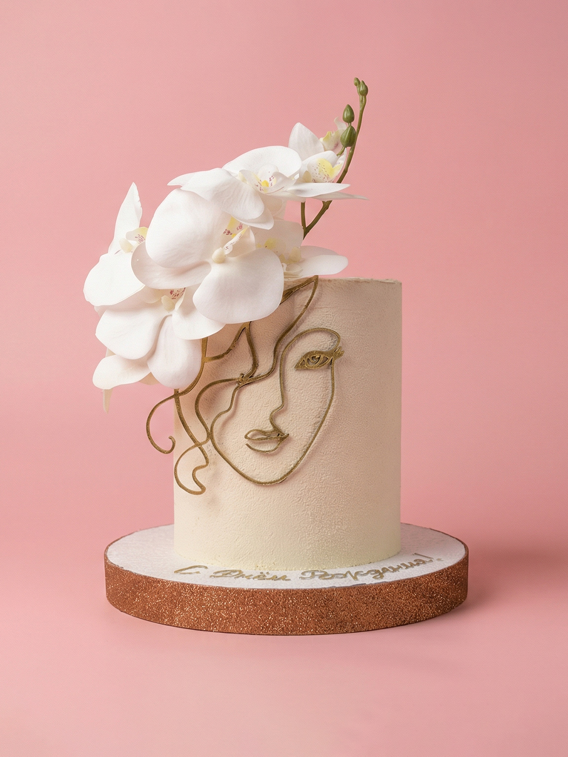 This cake is a poetic tribute to femininity and fine art. The tall tier is finished in a delicate cream chocolate velour, creating a flawless matte surface. The centerpiece is a minimalist female profile rendered in thin golden lines, which seems to emerge from the cake. It is crowned with a luxurious branch of fresh white orchids, their petals cascading down like a floral headpiece. The design is completed by a shimmering bronze-gold base.