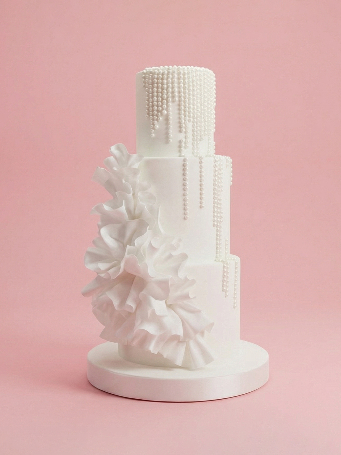 A flawless three-tier tower that embodies minimalist luxury and high-fashion elegance. The cake features a dramatic contrast between its smooth, matte-white surface and a voluminous vertical ruffle that mimics the flow of a couture gown. A sophisticated “waterfall” of multi-sized edible pearls drapes over the tiers, creating a rhythmic shimmer that exudes timeless sophistication.